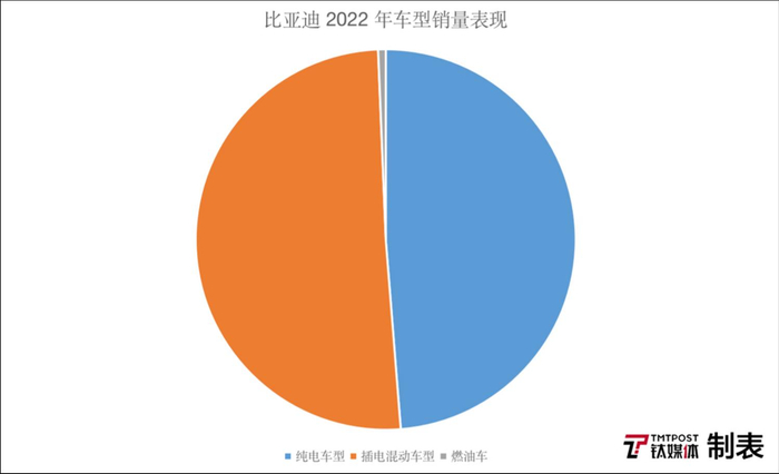 数据显示,比亚迪 2022 年全年累计销量达到了 186.9 万辆,其中来自纯电车型和插电混动车型销量分别为 91.1 万辆、94.6 万辆,燃油车销量仅有 1.2 万辆。