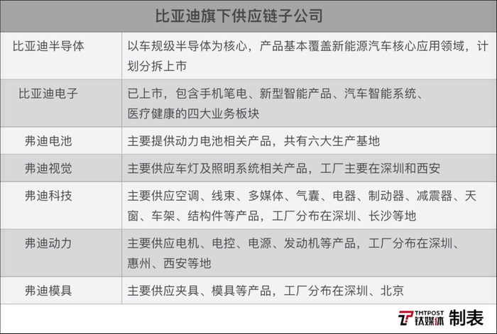据钛媒体 App 了解,以汽车业务为起点,比亚迪供应链配套的子公司已覆盖上中游,包括比亚迪半导体、比亚迪电、弗迪科技、弗迪电池、弗迪精工、弗迪动力、弗迪视觉/比亚迪照明等,涵盖了汽车相关的智能化零部件领域。