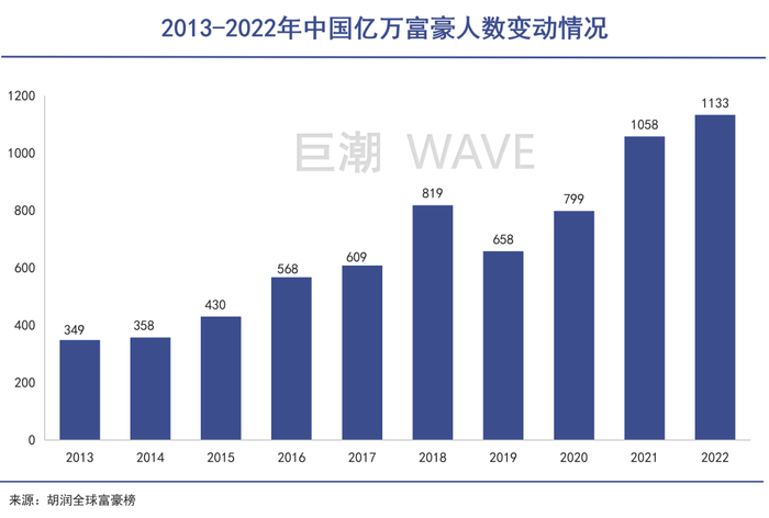根据胡润全球富豪榜统计来看,2018年以前,中国亿万富豪数量在五年间内出现增长超过134%。但是在之后四年内增长仅为38%。尤其是在2019年,中国亿万富豪数量历史性地出现下跌,虽然之后有所上扬,不过增速已经明显放缓。