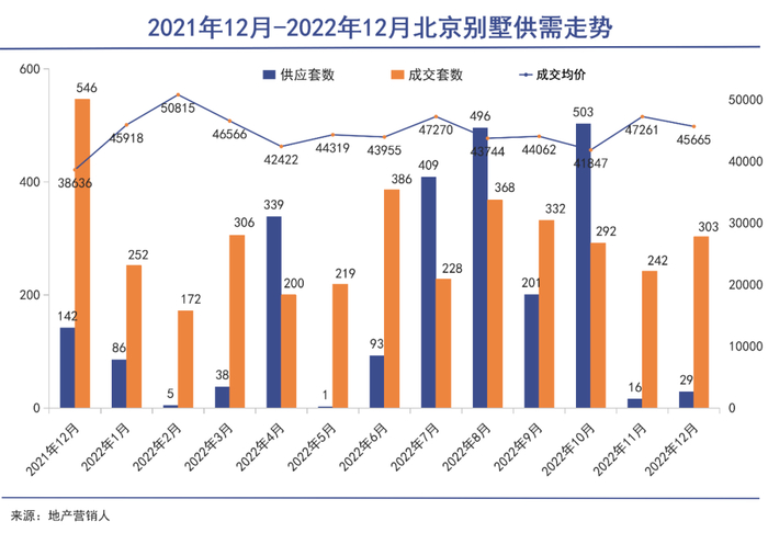 根据房地产自媒体“地产营销人”发布的数据显示,2022年,北京市别墅新增供应2216套,同比下降42%;成交3300套,同比下降34%;成交面积94.38万平,同比下降38%。