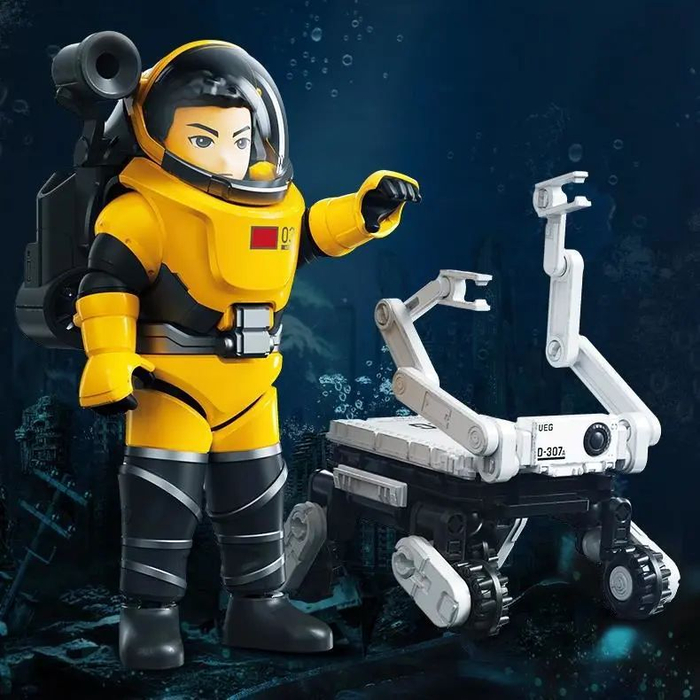 潜水员身穿黄色潜水服,11处关节可动。比如说膝盖、脚踝等地方,可以做多种造型。