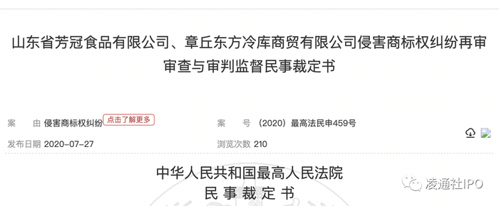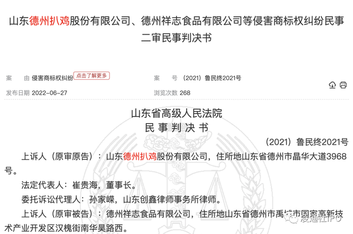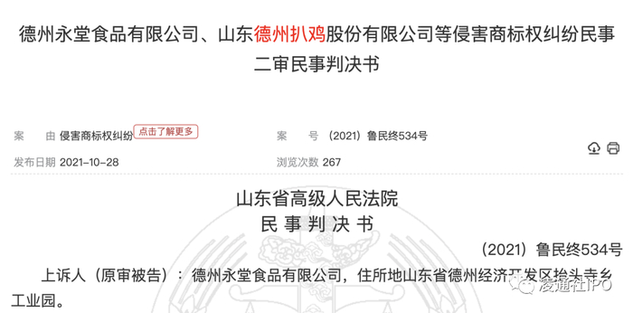 与此同时,IPO说明书显示,德州扒鸡的销售范围基本在华东(实质可能就是山东)范围,是一个区域性品牌,那么本次募资中2亿多的营销网络和品牌建设也很难改变现实,因为德州扒鸡面临的另外一个挑战是商标,凌通社在中国裁判文书网看到,德州扒鸡的商标案件比较多,个别还打到了高院,虽然最后德州扒鸡赢了,但并没有获得多少赔偿,说明了一个事实,虽然公司获得了德州扒鸡的商标权,但一个基本事实是,作为中华老字号,德州二个字是德州的地名而不是公司的注册商标,因此在德州生产扒鸡并说来自德州并不违规,被打擦边球的商标问题要解决几乎是没办法的。