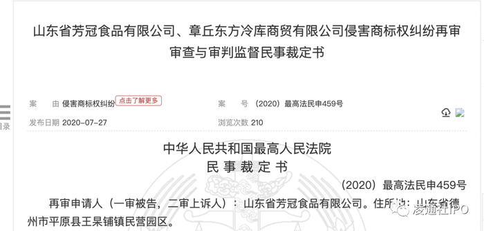 再审申请人山东省芳冠食品有限公司(以下简称芳冠公司)因与被申请人山东德州扒鸡股份有限公司(以下简称德州扒鸡公司),一审被告章丘东方冷库商贸有限公司(以下简称东方冷库公司)侵害商标权纠纷一案,不服山东省高级人民法院(2019)鲁民终851号民事判决,向本院申请再审。本院依法组成合议庭对本案进行了审查,现已审查终结。