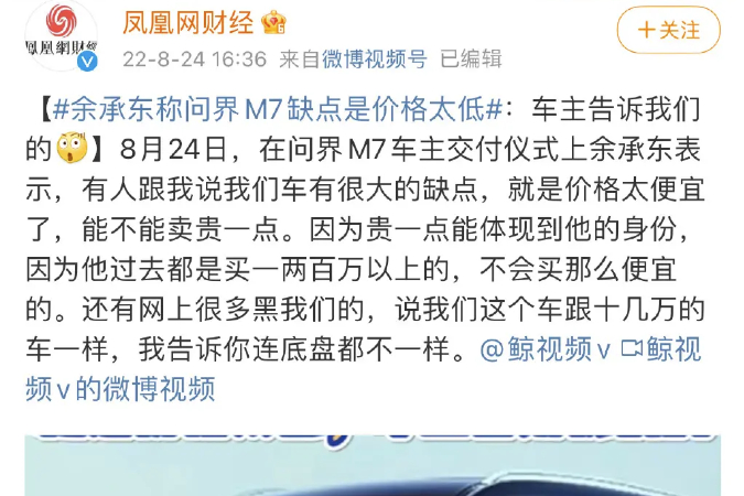 在问界M7首批车主交付会上,余承东就对记者说过:“有人和我说我们的车有一个缺点,就是卖得太便宜了,能不能卖得贵一点?我们过去都是买一两百万的车,不会买那么便宜的。”