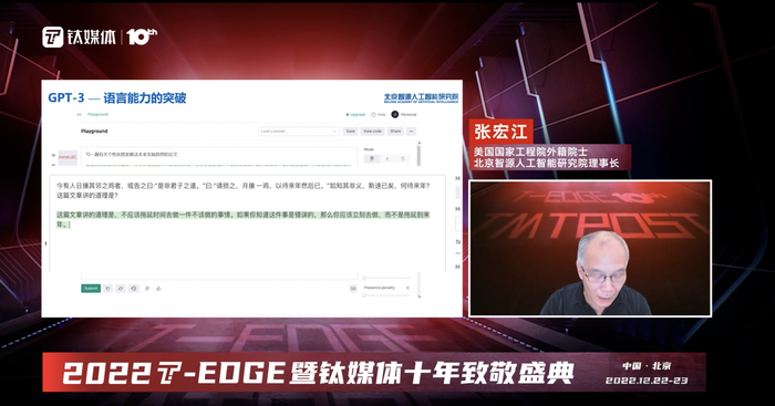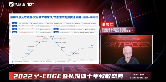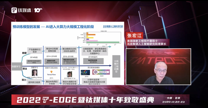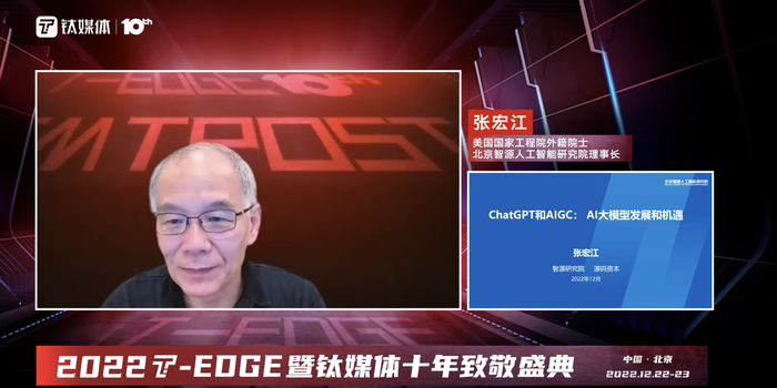 12月22日,美国国家工程院外籍院士、北京智源人工智能研究院理事张宏江在钛媒体2022T-EDGE大会上发表了《ChatGPT和AIGC爆火背后,Al 大模型的发展和机遇》的主题演讲。