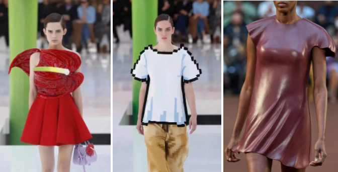 鞋上可以长草,衣服上就可以长花;人与植物可以融合,二次元与三次元就可以融合,“像素风”设计让模特仿佛置身于单机游戏中;二次元可以被带入现实,瞬间动态也可以被永远定格,Anderson将衣服的形状设计成被风吹拂或掀起的样子,材质硬挺,视觉效果却柔软。