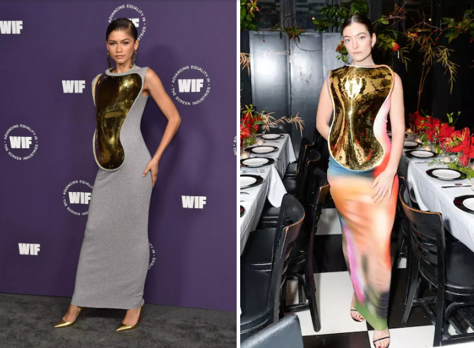 这些别出心裁的设计,为Loewe在社交平台上挣来了大量的关注度,也正中时髦精下怀。这次获蕾哈娜宠幸的胸甲,赞达亚、Lorde也穿过,只是她们穿的不是定制抹胸款,而是秀场成衣,胸甲的形状更抽象,光影效果也就更诡谲,更具说不清道不明的“未来感”。
