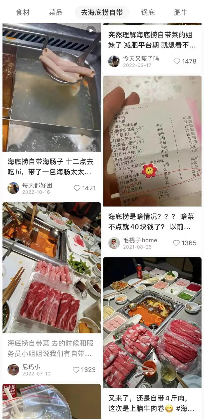 对于不再允许自带食材这一规定,除消费者外,部分专门探店海底捞做美食的博主也受到了影响。在小红书上搜索关键字“海底捞”,会自动跳出“去海底捞自带”分区,里面全是各类海底捞自带攻略和自制美食教程。博主@阿雪去年在小红书分享了自己带4斤肥牛去吃海底捞的经历,有粉丝评论“太过分了吧”、“你做了我不敢做的事”、“感觉自己亏了好多年,下次也这样”。