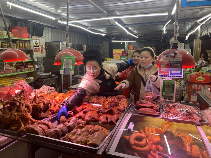 早上8点,是京贸物联的人流早高峰,在京贸物联2号厅,郭大姐的爱飞熟食店已经顾客盈门。半夜卤好的各类熟食已经晾干摆放在售货柜上。这些熟食有十几种,软烂入味的猪头肉、五香酱牛肉、卤味风干鸡、酱香猪肘子等。