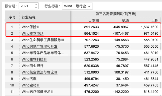 再具体一点,2021年,资本市场(主要为证券和期货公司)、保险、商业银行三大行业高管年度报酬均值分别为2821万元、2695万元、2092万元,是仅有的年度报酬均值突破2000万元的行业。