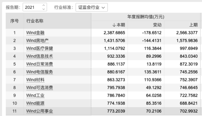 Wind信息显示,2021年,金融行业上市公司高管年度报酬均值高达2388万元,在所有11个大行业中排名“断层”第一,接近第二名房地产行业的2倍,超过最后一名公用事业的3倍。