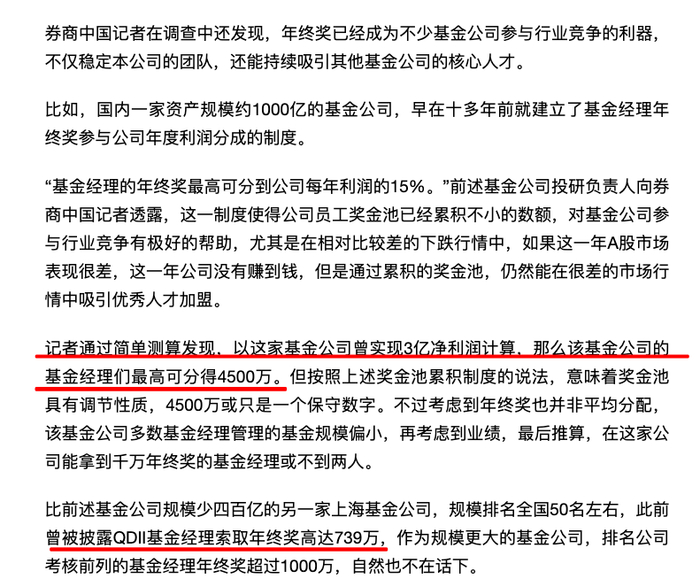 目前,市场上比较通行的说法是,基金经理团队可以获得基金管理费的15%。券商中国也曾报道,基金经理年终奖,最高可以分到公司年利润的15%。