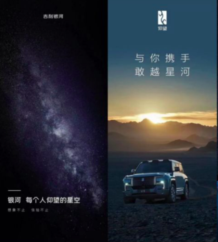 有意思的是,本次被控诉抄袭的吉利汽车,就在前不久为了宣传“银河”贴出一张海报,海报标语是“银河,每个人仰望的星空”。此文案也被质疑“碰瓷”前不久比亚迪推出的全新高端品牌“仰望”。对此,比亚迪也贴出“与你携手,敢越星河”的海报作为回应。