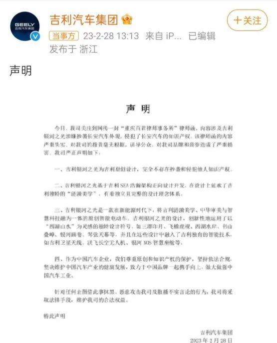 随着网络舆论的不断发酵,2月28日,吉利汽车集团官方发布声明回应称:该律师函误导公众,对我司品牌和商誉造成了严重损害。吉利银河之光为吉利原创设计,完全不存在抄袭和侵犯他人知识产权。