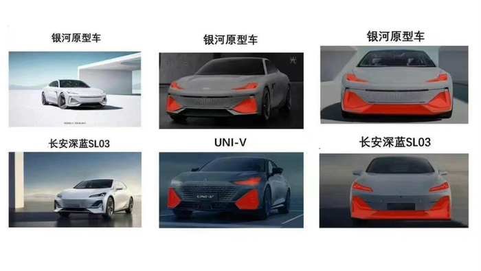 此传闻一出,网上一片哗然,随后有网友贴出了吉利与长安此次所涉车型的对比图。据业内人士指出,从银河之光原车型和长安深蓝SL03、UNI-V等车型的对比图来看,在前脸、大灯、尾部造型上,确实存在一些相似之处。