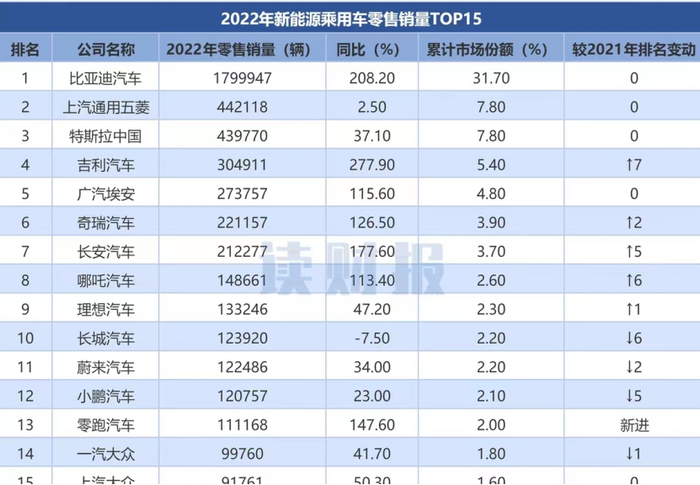 数据显示,2022年全年,吉利汽车的月销同比增幅稳定维持在100%以上,在新能源领域销量排名较2021年上升7位至第四,前三名分别为比亚迪汽车、上汽通用五菱以及特斯拉中国,TOP3加一起就占了新能源汽车市场的半壁江山。