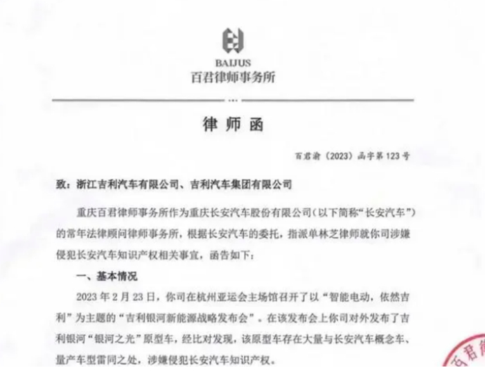 不过这边吉利话音刚落,长安汽车急了,直接给吉利发了一封律师函!理由就是近日吉利银河发布的“银河之光”原型车,存在大量与长安汽车概念车、量产车雷同之处,涉嫌侵犯长安汽车知识产权。