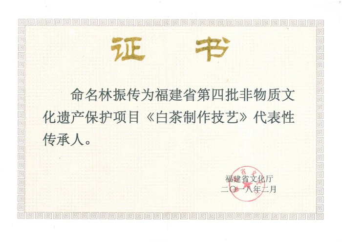 林振传,福建省第四批非物质文化遗产保护项目《白茶制作技艺》代表性传承人。