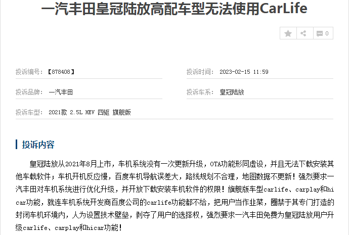 针对皇冠陆放的车机问题,许多车主也曾求助于4S店、或者是一汽丰田,但至今仍未得到解决方案。于是乎,皇冠陆放便在近几个月之内,成为了各大投诉网站的“红人”。