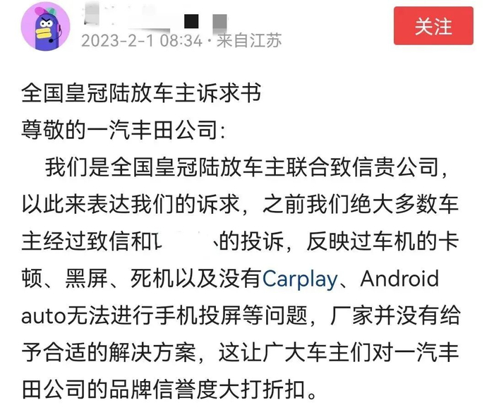 主流的社交媒体中,相关车主也在展开集体维权。例如在2023年2月份,小红书上就出现了一则《全国皇冠陆放车主诉求书》。