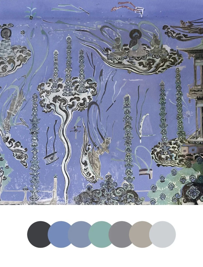 第一篇章《如是我见》中,我用朝代的脉络将北凉到元代的色彩串了起来。敦煌洞窟在每个朝代都有它的主要代表颜色,与它的地缘政治、经济都息息相关。