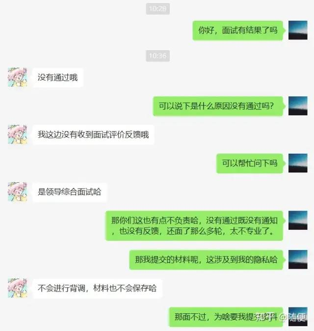 这就很让我无语了,你说面了这么多轮,不通过也就算了,合不合适看缘分就好,但是连个原因都没有就有点过分了,还要了我那么多材料,工资流水什么的。