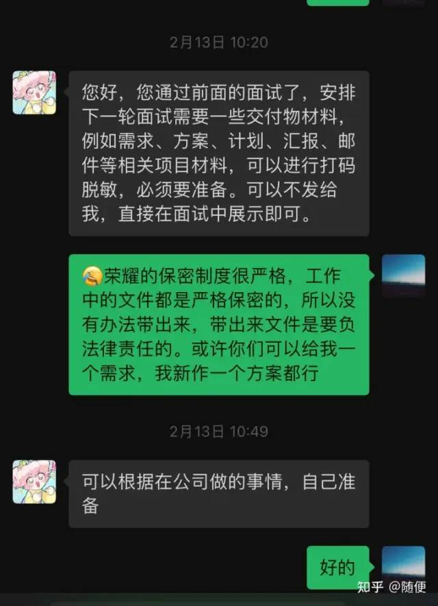 在面第四轮之前,HR通知我要准备一下之前公司的交付件。这就很让我感到惊讶,还有面试要其他公司业务方案的,当然处于职业操守我没有答应。我说我没有之前公司的材料,因为是严格保密的,泄露了是需要负法律责任的。我只能根据我的记忆重写写一个ppt,用来阐述我们的交付流程。
