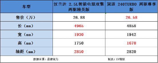 在价格差别不大的情况下,笔者用售价为26.88万元的汉兰达 2.5L智能电混双擎两驱精英版与售价为26.58万元的冠道 240TURBO 两驱尊享版对比。
