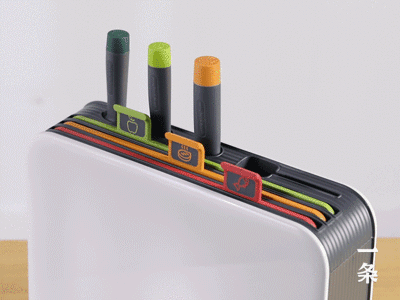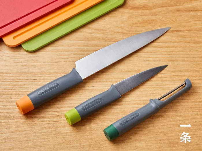 配的3把刀,使用起来十分顺手!和菜板上的图标、颜色相对应。