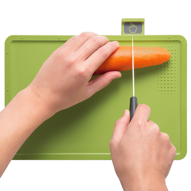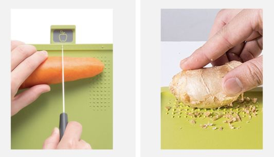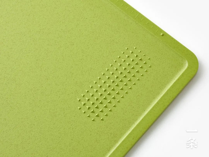 这个绿色的果蔬菜板,上方设有刻度线,右侧的尖锐凸起处,则是研磨区。