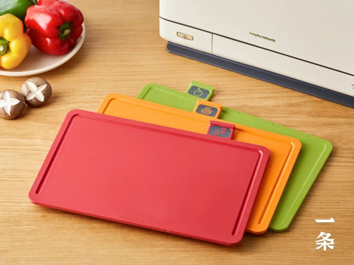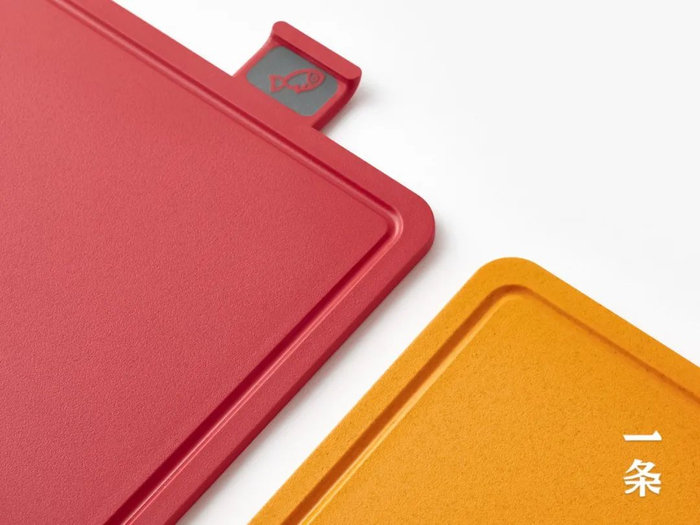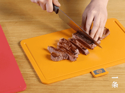 红色、橘色菜板边缘均设有环绕水槽,这样切肉时,汁水就不容易流到台面上。