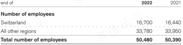 薪酬和福利从2010年的146亿瑞郎下降至2022年的88亿瑞郎,降幅40%,不及同期的营收降幅52%。