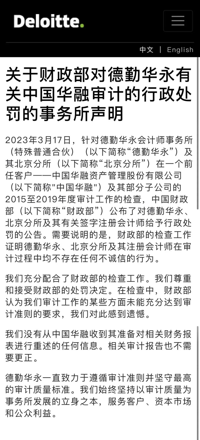 德勤亦表示,其没有从华融收到其准备对相关财务报表进行重述的任何信息,相关审计报告也不需要更正。