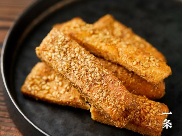 这款黄金馕片,精选天山优质小麦制成的馕饼,切条后经炸、烤、拌料等9道工序制作而成。