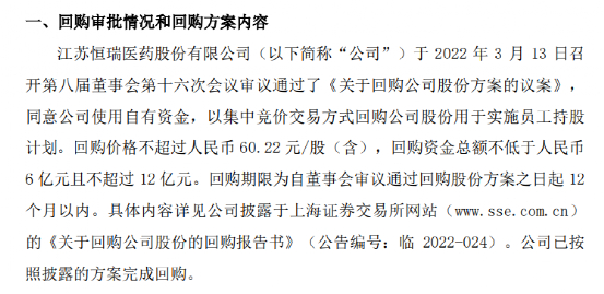 2022年3月,恒瑞医药的管理层对自家股价的持续下跌,也憋出了回购股票这一“大招”。 3 月13 日恒瑞医药审议通过了《关于回购公司股份方案的议案》,同意公司使用自有资金,以集中竞价交易方式回购公司股份用于实施员工持股计划。回购价格不超过人民币 60.22 元/股(含),回购资金总额不低于人民币6 亿元且不超过 12 亿元。