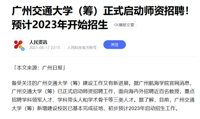 放眼整个大湾区,同样在努力引进高校、研究院。2023年,大湾区预计将有4所新大学开始首次招生,分别是广州交通大学、香港科技大学(广州)、大湾区大学、香港城市大学(东莞)。与此同时,香港理工大学(佛山)、香港都会大学(肇庆)、香港大学(深圳)还在建设中。