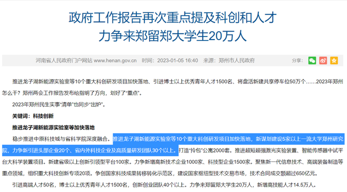 作为河南省会,郑州市也在开年的政府工作报告中立下了flag:今年将推进龙子湖新能源实验室等10个重大科创研发项目加快落地,新谋划建设5家以上一流大学(科研机构)郑州研究院,力争新引进头部企业20个、省内外科技企业及高质量研发团队30个以上。