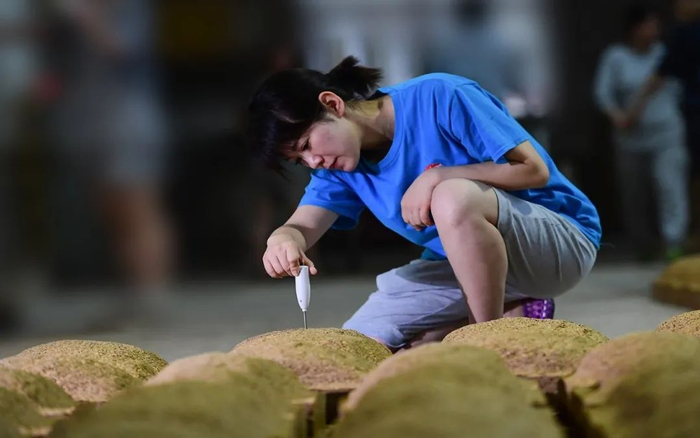 |茅台制曲工测量刚踩制的曲块高度,检验曲块是否合格,一般二十分钟一次。摄影@茅台时空