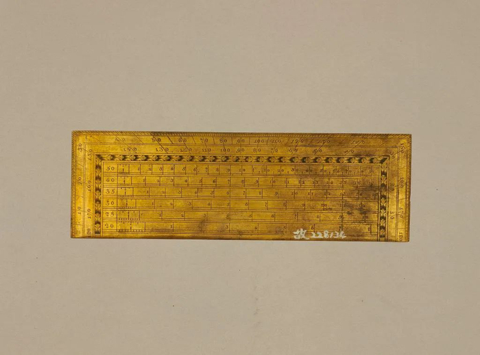|《铜镀金综合算尺》是一既可绘图又可测量的工具。它的一面分上、下两种尺度,上侧为分厘尺,下侧刻有三角函数名称及刻度。另一面四周是量角器。中间是一个比例缩尺,可将线段长度扩大或缩小。图/故宫博物院