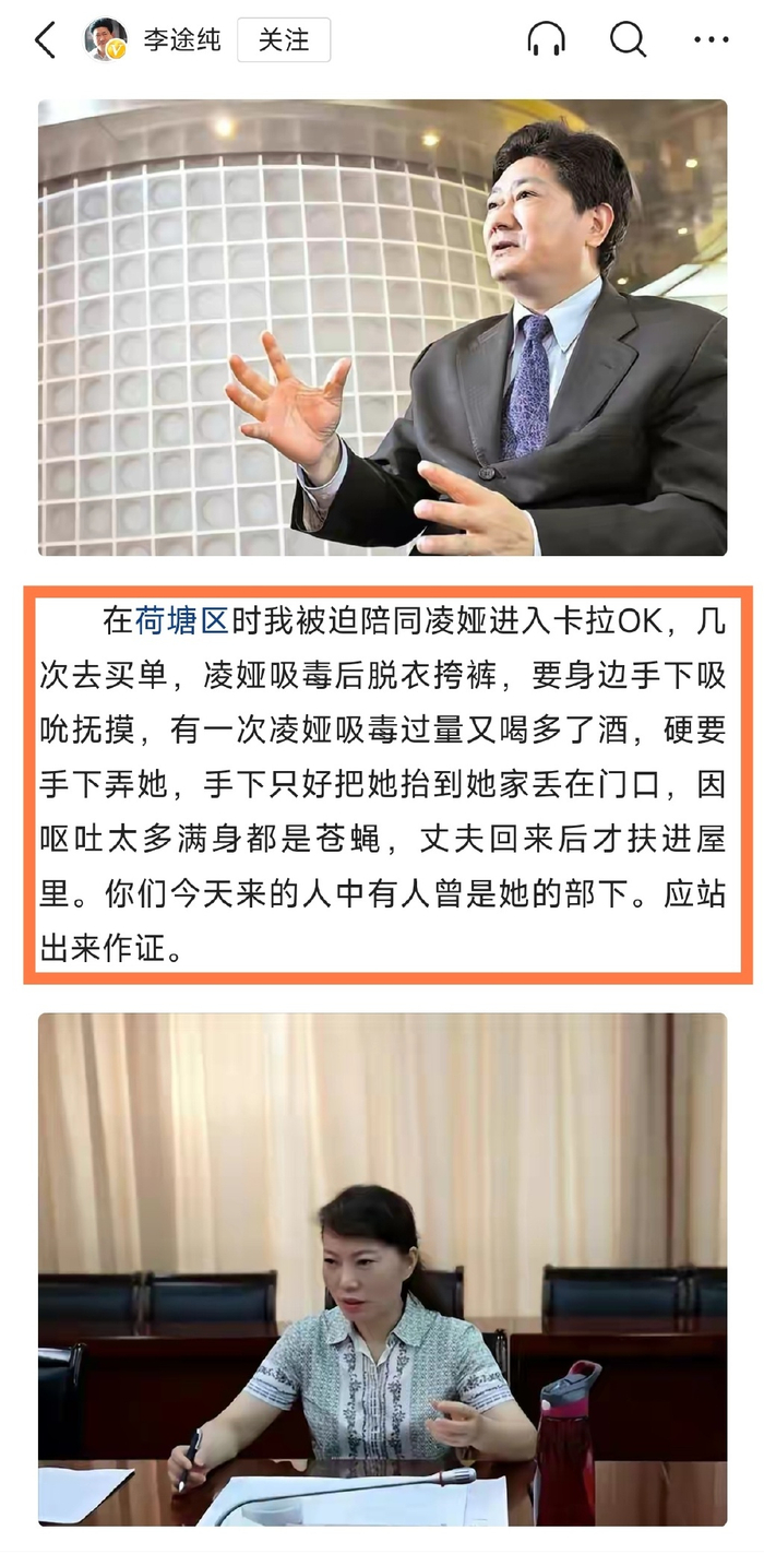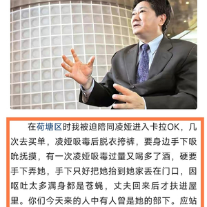 15年前“太子奶”案受害者李途纯,开始在网络上公开曝光凌娅掌吸毒以及与手下在公众场所胡来等众多内幕,直言凌娅是整垮“太子奶”集团的凶手之一。
