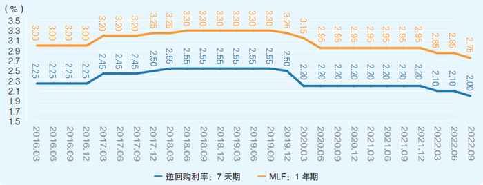 图4、2016-2022年公开市场逆回购利率(7 天期)、MLF 利率(1 年期)
