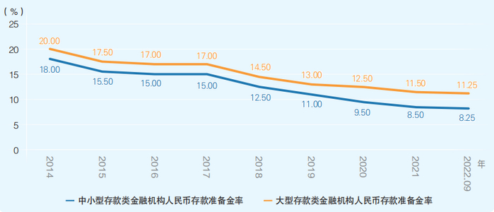 图2、2014-2022年中小型、大型存款类金融机构人民币存款准备金率