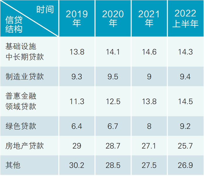 下表简要给出了近4年以来中国结构性信贷的变化,主要体现在以下几个方面:一是基础设施中长期贷款保持基本稳定。基础设施中长期贷款比重近四年保持在14%左右,新型基础设施建设仍有发力空间。二是制造业贷款低水平维稳。制造业是实体经济的根基,“十四五”规划提出保持制造业比重基本稳定。自2019年以来,制造业贷款比重保持基本稳定,但体量相对较小,占比不足10%。其中,制造业中长期贷款自2020年6月以来保持较高增速,2020年末同比达到35.2%的高位,高技术制造业中长期贷款于2021年末同比达到32.8%,增长趋势较为乐观。三是普惠金融领域贷款蓬勃发展。2018年以来,人民银行不断加大对普惠金融领域的政策倾斜,贷款比重持续上升,自2019年末的11.3%上升至2022年6月末的14.5%。截至2022年6月末,普惠金融领域贷款比重仅次于房地产贷款,在各项结构性贷款中排行第二。普惠小微授信主体达5239万户,是2019年末的1.9倍。四是绿色贷款比重稳步上升。自2020年9月“双碳”目标提出以来,经济逐渐向绿色低碳转型,绿色贷款比重不断上升,涨幅不断提高。截至2022年6月末,绿色贷款余额为19.55万亿元,同比增长40.4%,占比达到9.2%。五是以房地产为代表的资金密集型领域信贷需求趋势性转弱。在“三道红线”、房地产贷款集中度管理制度等宏观审慎政策的协调配合下,房地产领域贷款需求转弱,贷款比重从2019年末的29%下行至2022年6月末的25.7%。