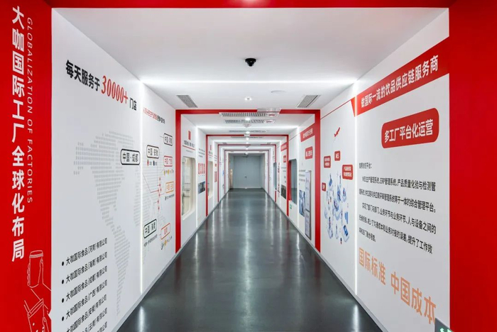 目前大咖国际550亩智能制造产业园、50000平生产车间,覆盖了全国30000+门店,35%的区域能实现12小时送达,未来二期工程建好后,终极目标是能支撑全国茶饮行业1/3以上的门店供应。
