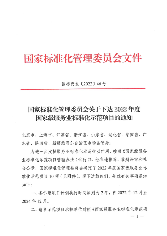 2022年12月30日,国家标准化管理委员会下发了“2022年度国家级服务业标准化示范项目”的通知,“山东省明德物业服务标准化示范项目”成功获批,成为全国十个入选项目之一,物业行业唯一入选项目。这是明德集团继国家级服务业标准化试点后,用标准提升服务,打造行业标杆的又一探索。