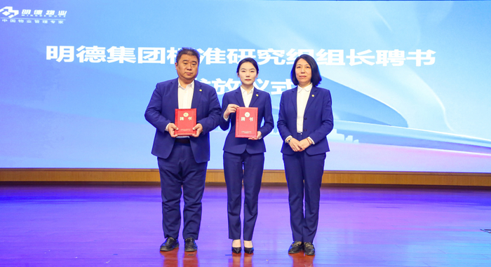 集团于2021年10月成立明德标准化研究院,下设业态标准研究组、条线标准研究组及效能标准研究组。会上,集团副总裁兼明德标准化研究院院长金艺为高校、医院、商写、环卫业态标准研究组组长及工程条线、会服条线标准研究组组长发放了聘书。