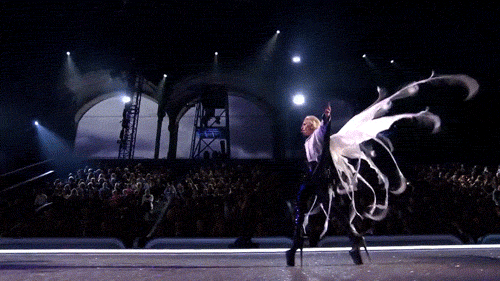 在同一场次,Gaga还穿了Deadlotus Couture的黑紫相间的贴身连体衣,搭配蒙面长须头盔,仿佛cos了一只来自未来的机器昆虫,猛一看还怪吓人的……