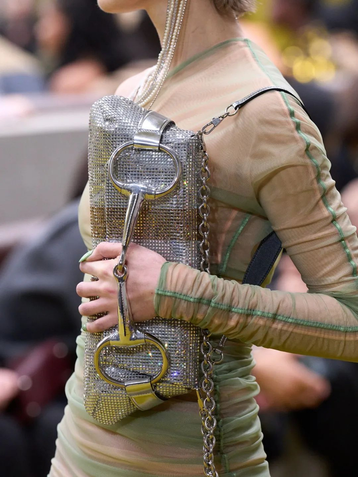 Gucci的历任设计师都对马衔扣元素做过各式各样的焕新诠释,在最新一季的秀场上,能看到那些带有大号马衔扣的千禧年手拿包又默默回潮了。