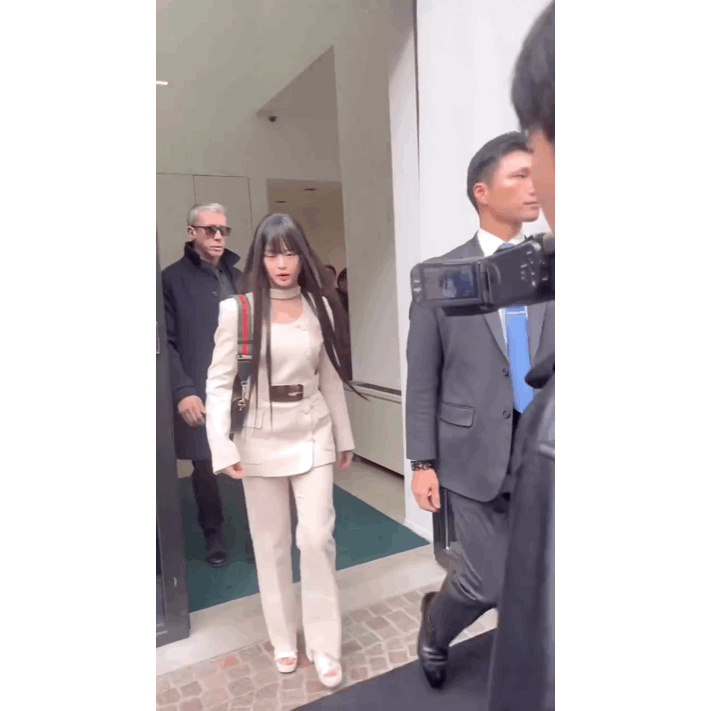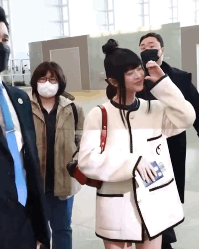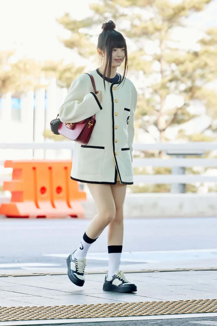 Hanni在首尔机场的出发造型是一件Gucci米白色外套,梳着丸子头的她选择光腿搭配球鞋亮相,是Gen-Z爱豆的标准打扮。
