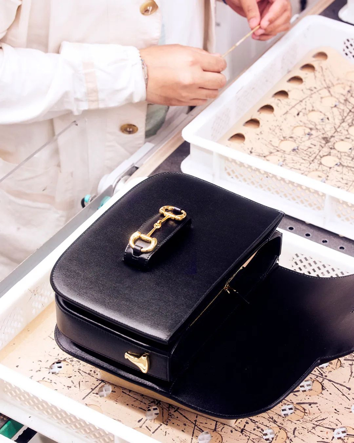 手袋正中央的那一根杆和两个圆环,串连着Gucci和马术运动七十年的渊源,也横跨了这款手袋从古典到摩登,从旧到新的历史蜕变。